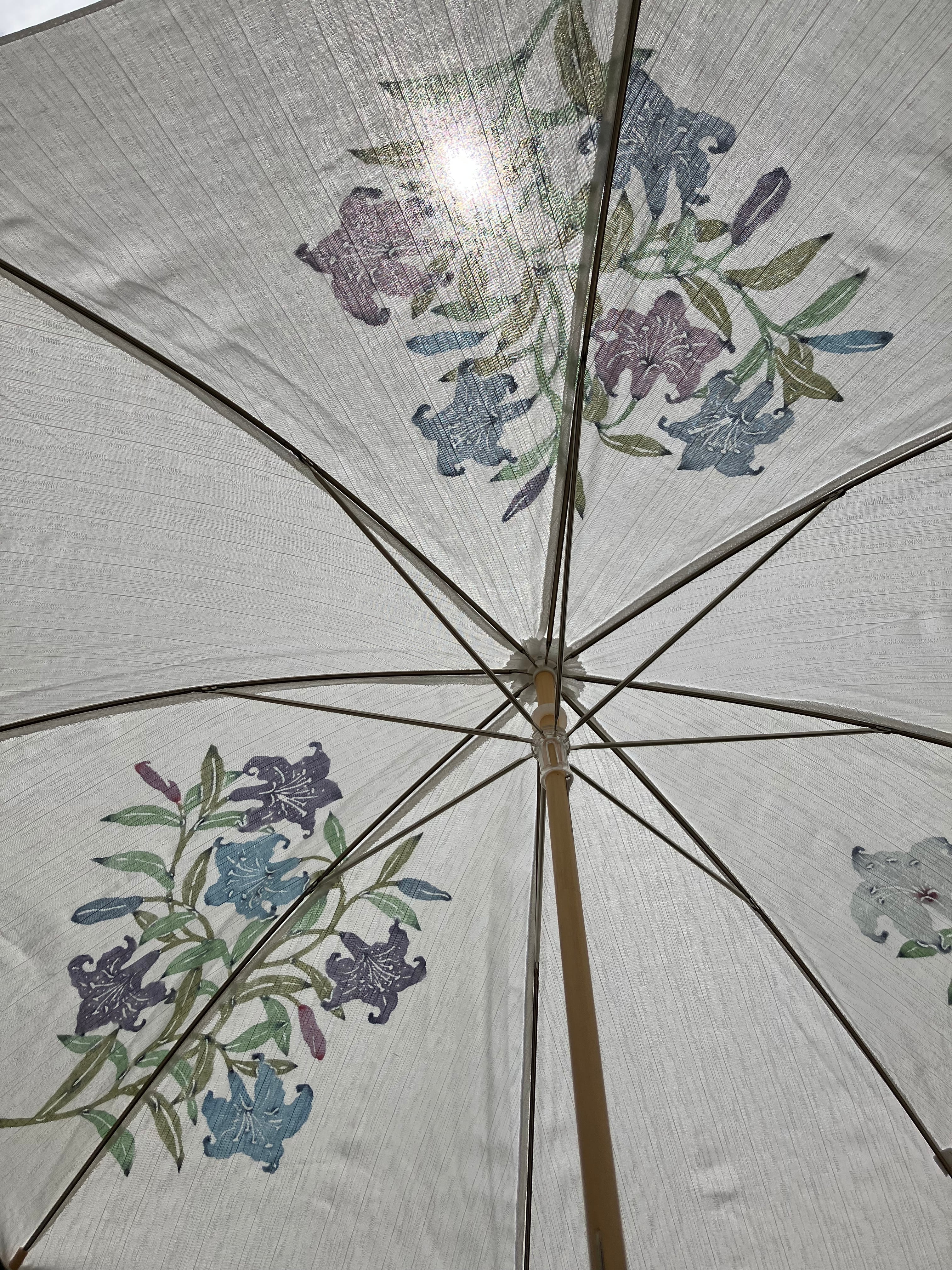 生成りの麻地と異なり、百合の花が白地にはっきりと映えます。とはいえ、落ち着いた青系で色差ししてありますので、上品な雰囲気を感じていただけると思います。UV加工を施してありますので夏の日差しをやさしく遮ります。(完全遮光ではありません)
